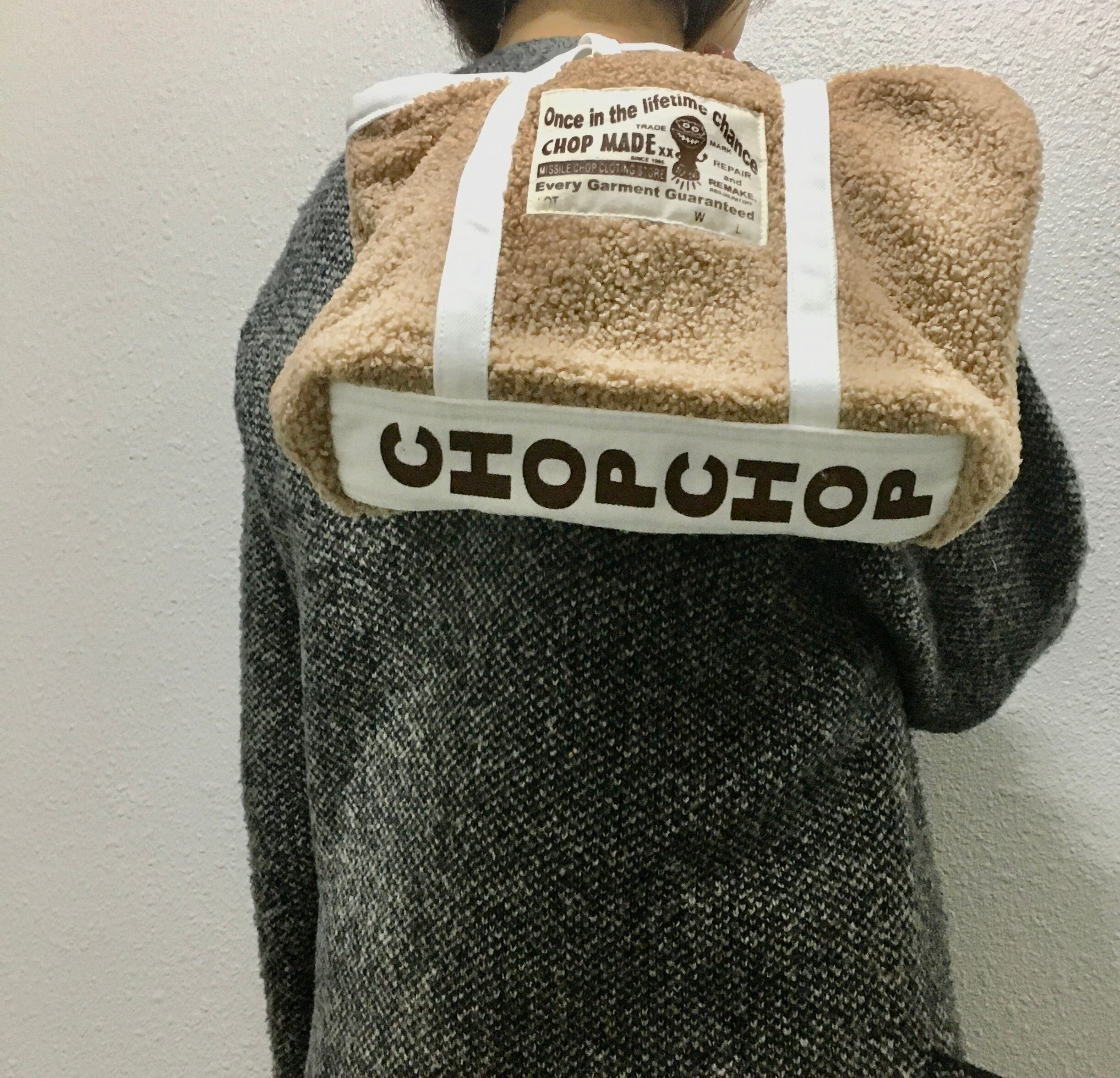 ボディには暖かみのある毛足の短いボア生地を使用、持ち手&底生地には丈夫なホワイトデニムを使ってます。内側ポケットはタテ10cmヨコ12cm、同生地のミニポーチは取り外しOK!