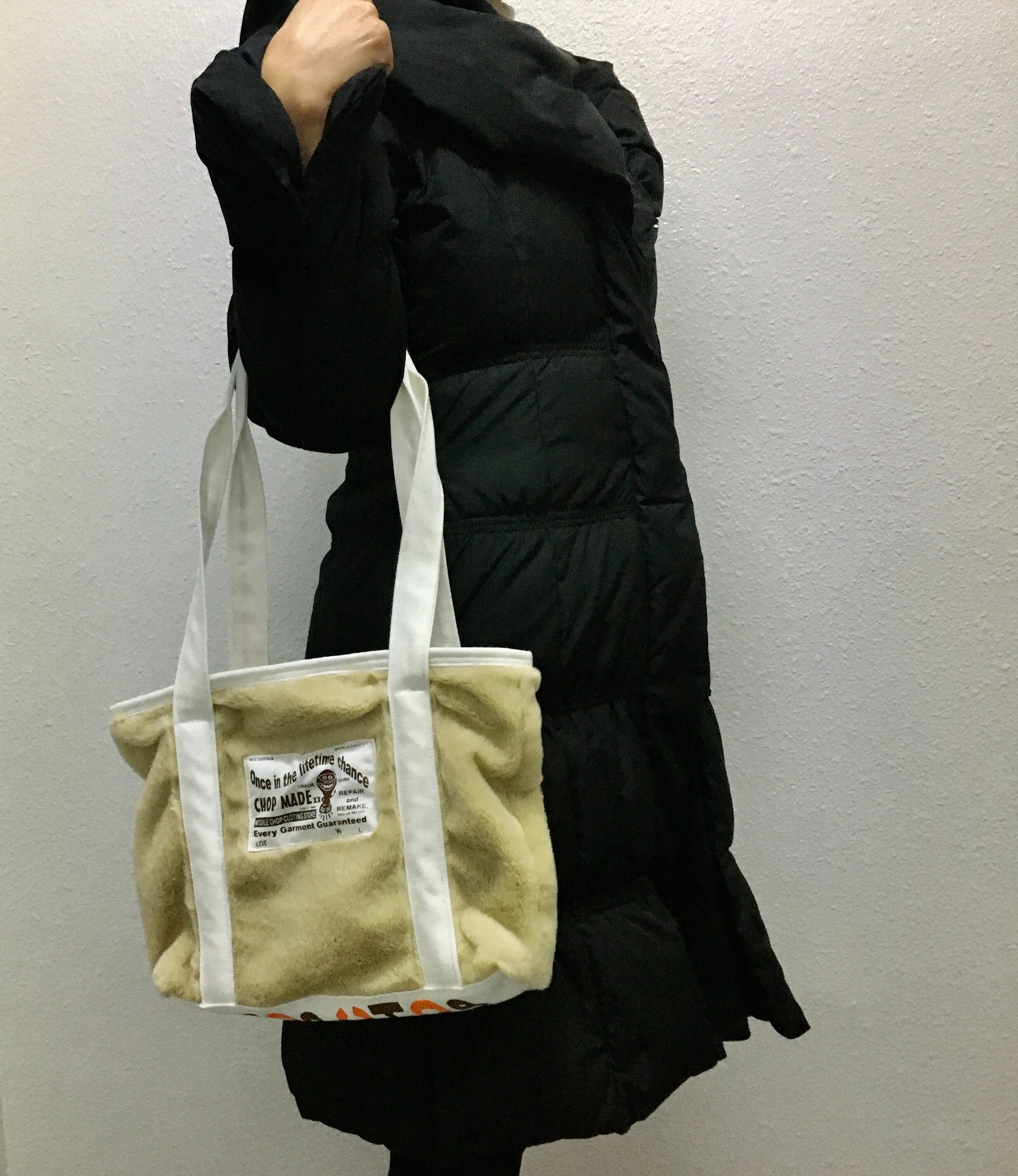 フワフワとした抜群の手触りのファーを全面に使用、持ち手と底面には丈夫なホワイトデニムでバイカラーに仕上げています。内面には小物入れに便利ポケット付き、ちょっとした外出に活躍する小ぶりなトートですよ!
