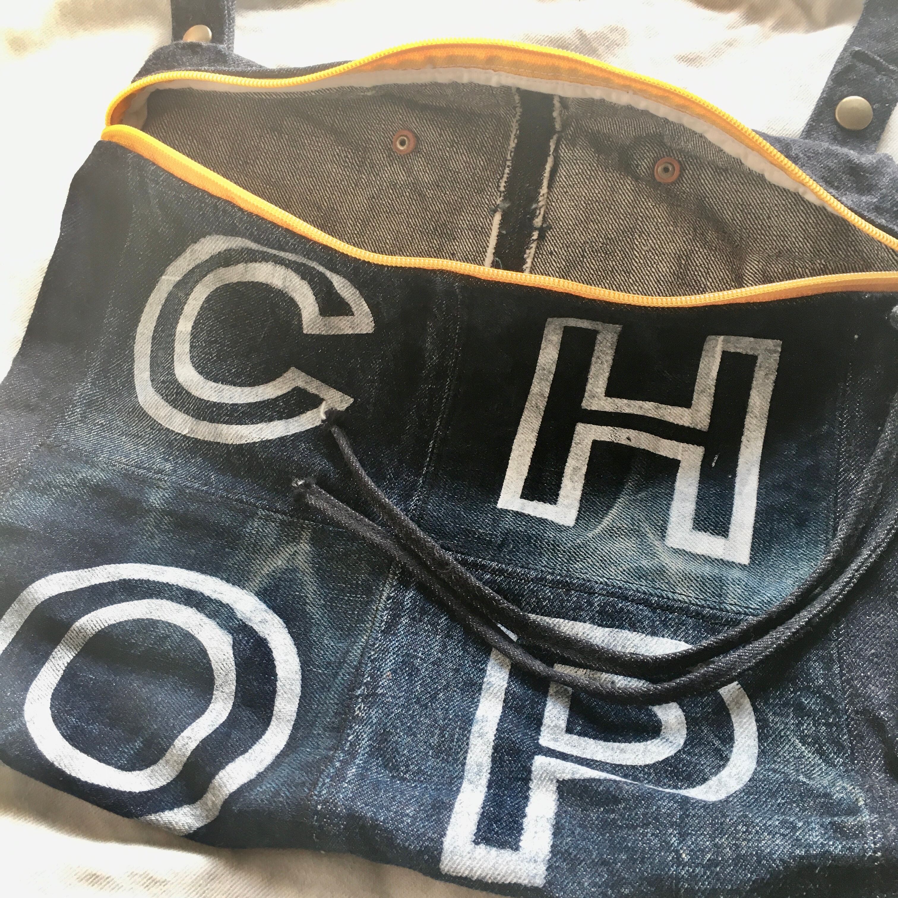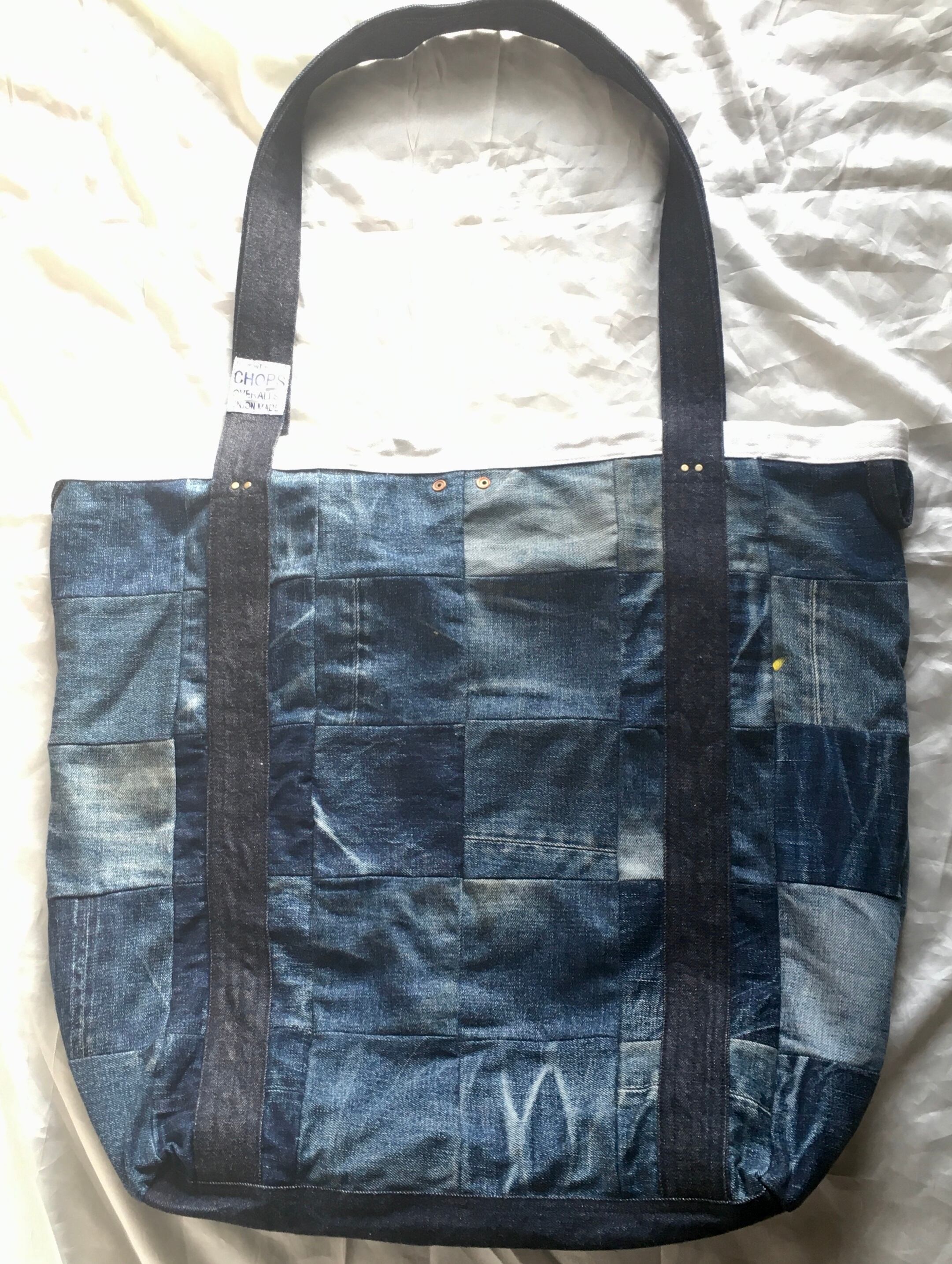 色落ち&ダメージ具合がとっても良いuesdジーンズをパッチワークにしトートバックへリメイクした1点モノ‼︎ホワイトデニムの裏地付き、大きめな内側ポケットと取り外しできるポーチ付きです。